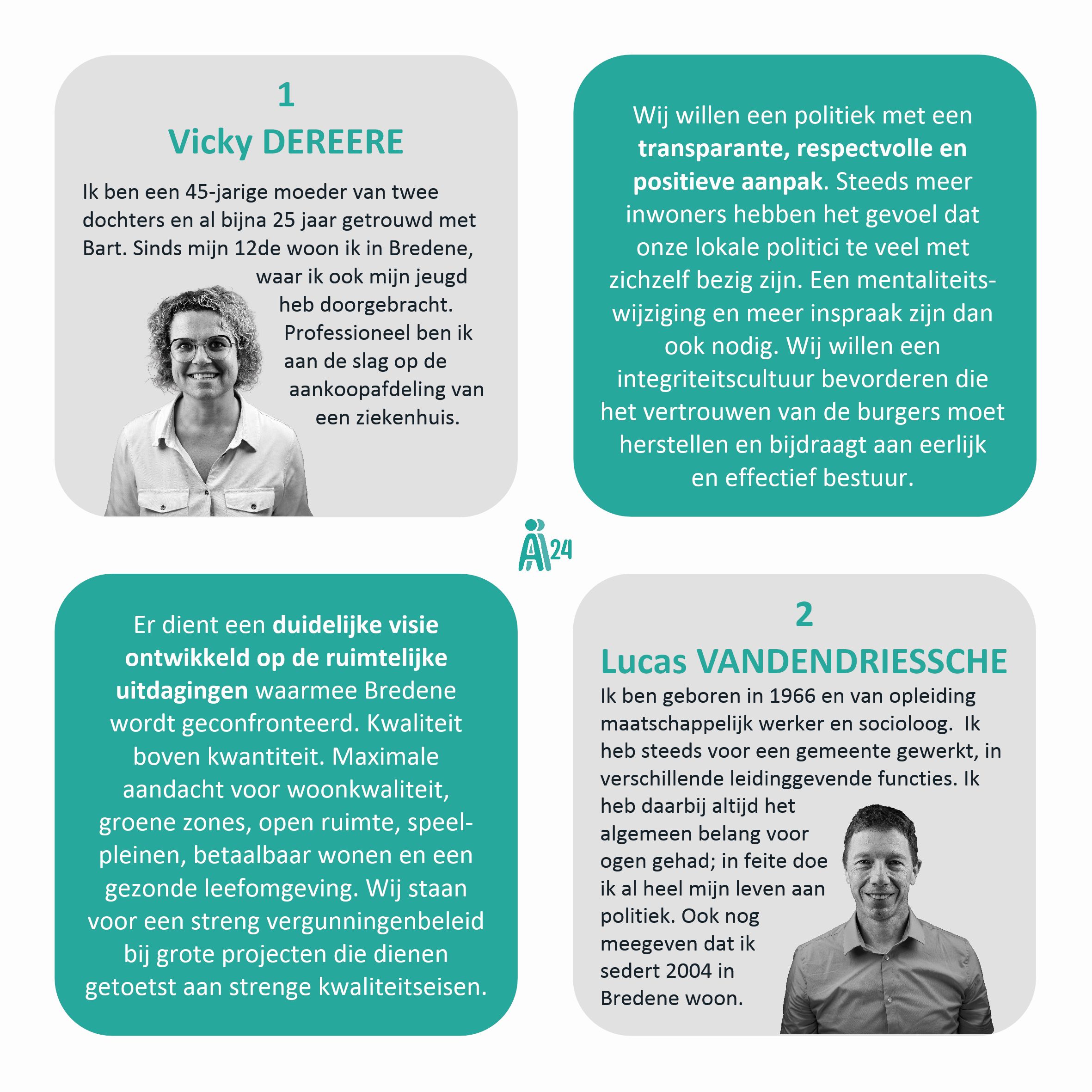 Ons programma is goed doordacht. Het vertrekt van een analyse en een visie die veel Bredenaars delen. Een andere bestuursaanpak dringt zich op: planmatig werken met participatie van de burger. En dit op een correcte, deontologische manier. Dat is onze rode lijn. Dat vertaalt zich in een lijst acties en voorstellen op vlak van financieel beleid, mobiliteit, ruimtelijke ordening, jeugd, samenleven, enz.